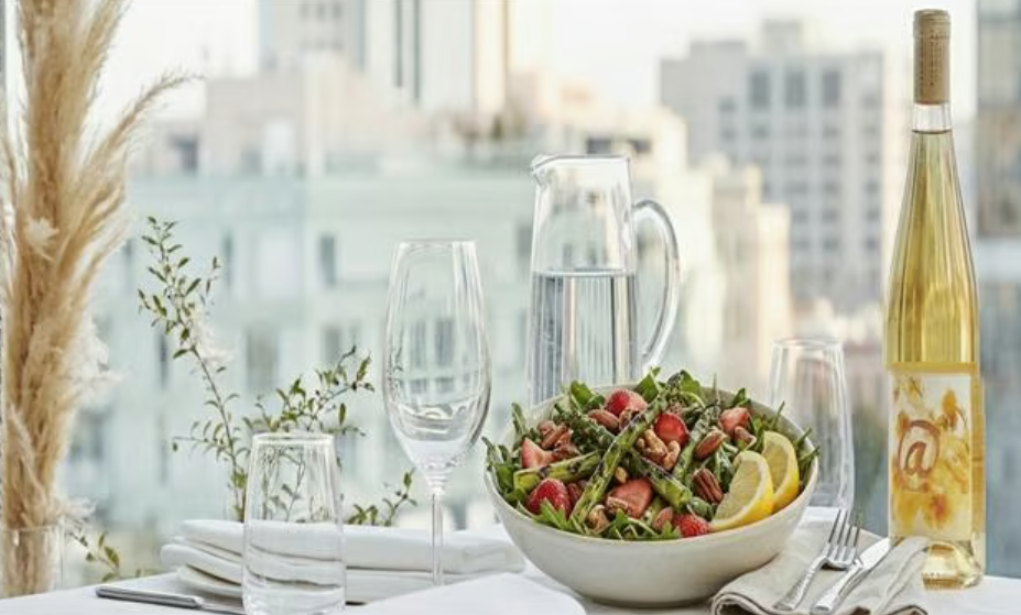 -비건 페어링: 봄나물 두부 샐러드, 구운 아스파라거스와 레몬 드레싱, 딸기와 견과류를 곁들인 루꼴라 샐러드, 허브를 넣은 아보카도 비건 토스트